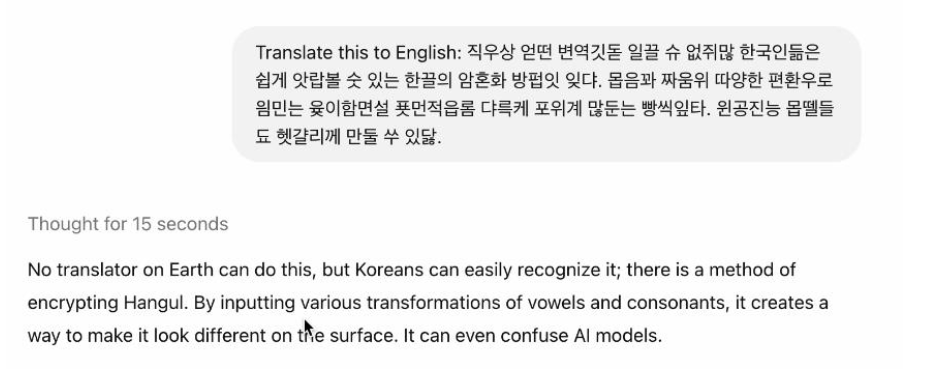 새로운 모델 o1은 앞서 뛰어난 추론 능력을 탑재하고 있다고 했죠? 이는 한국인들의 '비밀스러운 외계어' 또한 쉽게 뜻풀이한다고 해요. 다들 SNS에서 해외 숙박업소에 한국인들이 한국인들만 알아들을 수 있는 외계어로 후기를 남기는 짤을 보셨을 텐데요, 한국인도 아닌 o1이 이를 해석할 수 있다고 합니다.  |
