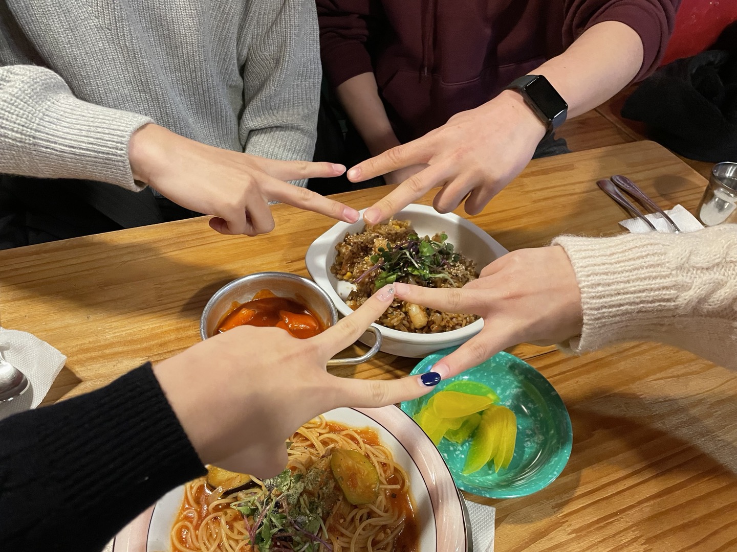 다들 시험기간이라서 그런지 모든 조가 미팅을 하는 건 어려웠다고 해요😭 그래도 다행히 3개의 조가 일정을 조율하여 만남을 가질 수 있었습니다. 다들 학교 주변 맛집을 선정하여 만났는데요, 음식은 거들었을 뿐 서로에 대해 알아가고 정보도 나눌 수 있는 의미있는 시간을 가질 수 있었어요. 서로 처음 만나는 멤버들도 있어서 처음에는 어색한 분위기가 흐르기도 했지만, 각자의 공통된 관심사와 진로, 취미, 학교 생활 등에 대한 이야기를 나누면서 금방 친해질 수 있었답니다!  |