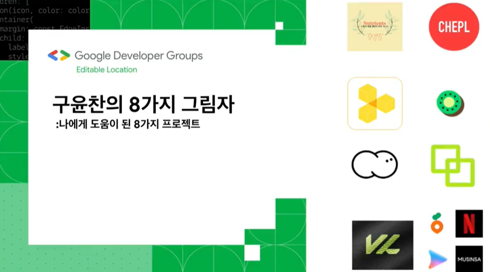 구윤찬 님의 “구윤찬의 8가지 그림자”에서는 직접 8가지 프로젝트에 참여하고 운영했던 경험들과 그로 인해 무엇을 느끼고 무엇이 남았는가에 대해 이야기를 나눠주셨습니다. 여기서 무엇이 느끼고 무엇이 남았는가에 대해 (남들과는 다른) 새로운 경험, (새로운 것의 동작 원리와 장단점을 파악 후 사용하는) 항상 새로운 것, (일단 시도해 보는) Just Do It 이렇게 3가지를 이야기했습니다!  |