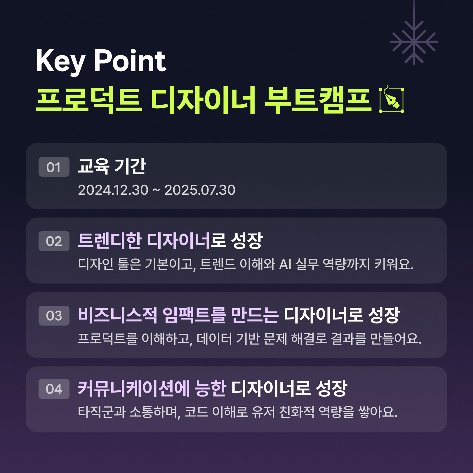 - 실제 기업 데이터 분석을 기반으로 ‘기획하는 디자이너’가 될 거에요.
