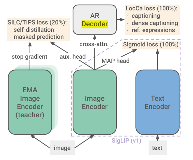 SigLIP 2는 이미지 인코더에 텍스트를 생성하는 트랜스포머 디코더를 결합해, ‘이미지 캡션 생성’이나 ‘특정 영역 설명 예측’ 같은 과제를 함께 학습합니다. 이런 과정을 거치며 모델은 이미지 속 객체들의 공간적 관계와 위치를 더욱 세밀하게 이해합니다.
