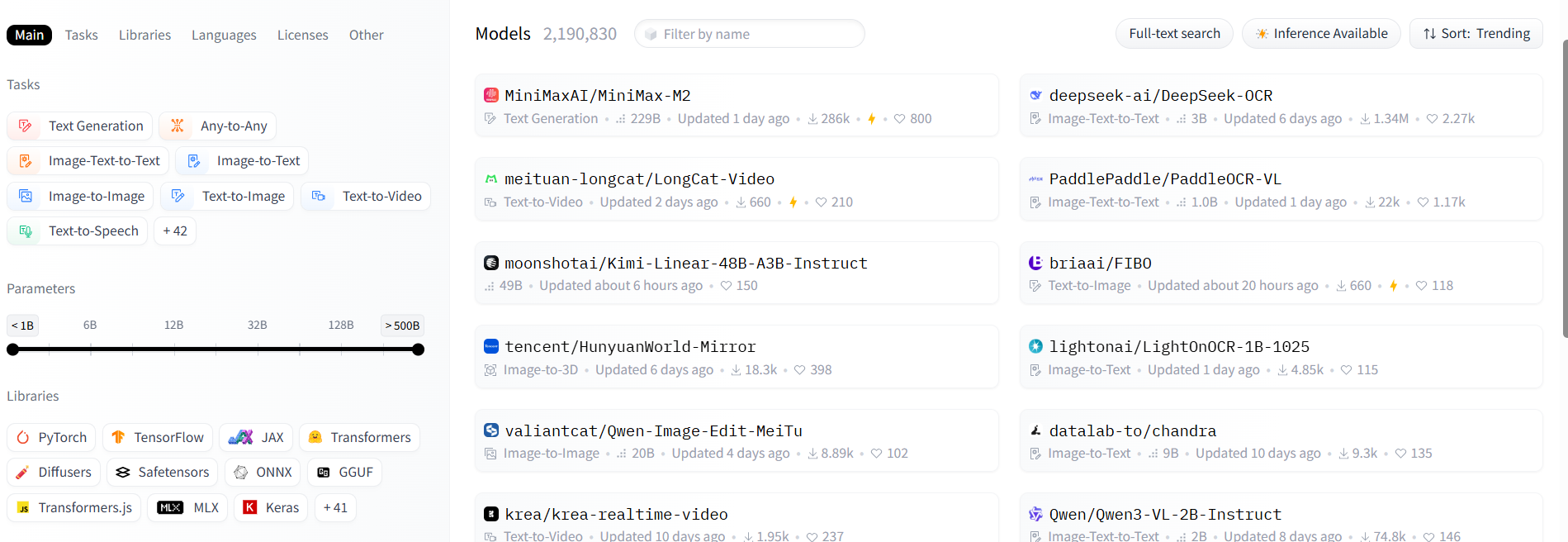 - Models: 허깅페이스의 심장이라고 할 수 있습니다. 전 세계의 개발자들이 훈련한 현재 약 200만 개의 사전 학습(Pre-trained) AI 모델들이 가득 모여 있는 곳이죠. 개발자들은 텍스트 생성, 이미지 분류, 음성 인식과 같은 원하는 모델을 허브에서 찾아 내려받을 수 있고 자신의 입맛에 맞게 직접 조정도 가능합니다. 이른바 파인 튜닝(Fine-tuning)이 가능하죠!