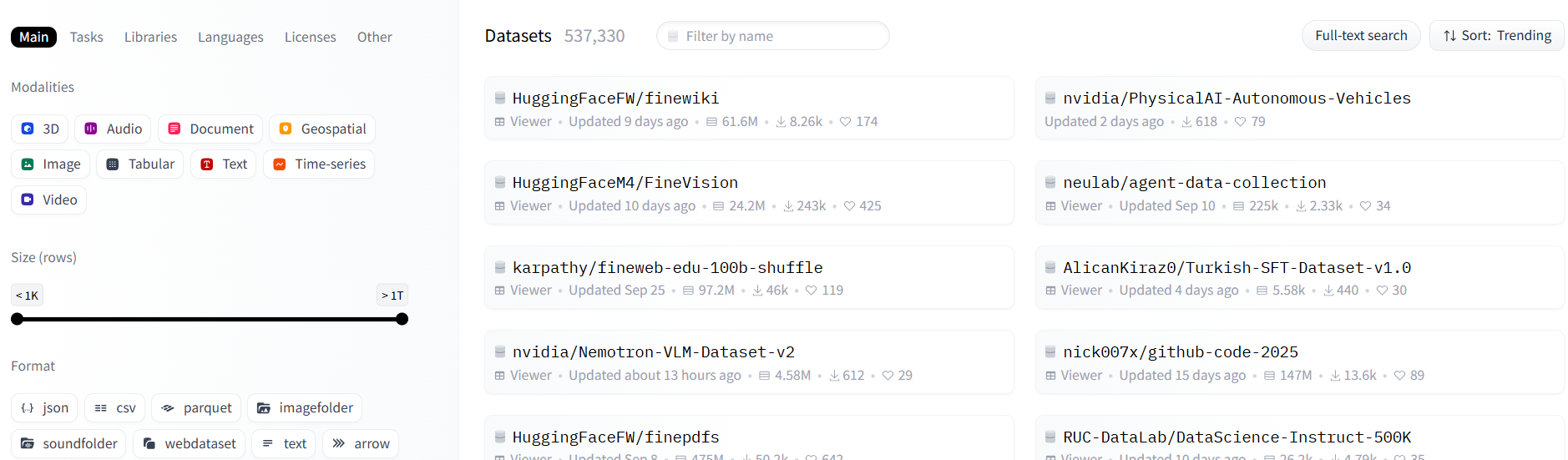 - Datasets: AI 모델을 효과적으로 훈련하기 위해선 적절한 데이터가 반드시 필요합니다. 허깅페이스는 현재 50여만 개의 데이터셋을 공유하고 있으며, 이를 쉽게 불러와 사용할 수 있도록 표준화된 라이브러리를 제공합니다. 덕분에 누구나 복잡한 데이터 준비 과정을 거치지 않고도 개발에 도전할 수 있겠네요!