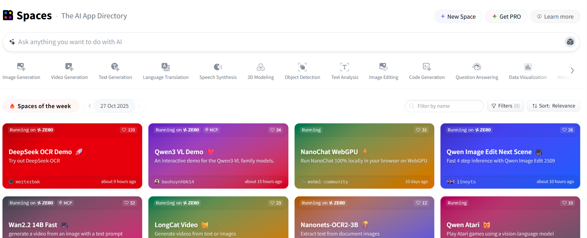 - Spaces: 개발한 AI 모델을 누구나 쉽게 테스트하고 시연(Demo)할 수 있도록 웹 애플리케이션으로 호스팅 해주는 공간입니다.  복잡한 서버 환경을 따로 구축할 필요 없이 자신의 모델이 실제로 어떻게 작동하는지 세상에 공개하고 피드백을 받을 수 있습니다!