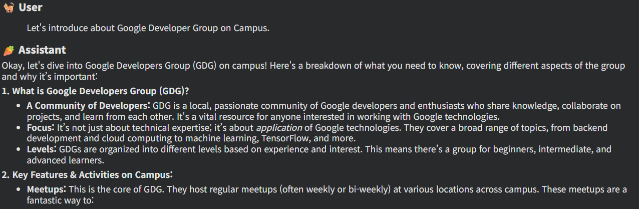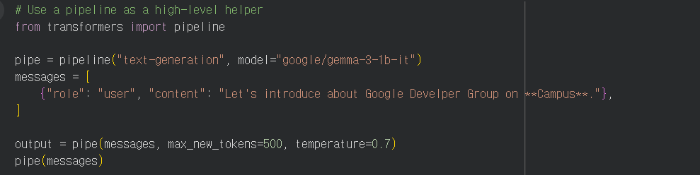 그럼 이제, 직접 허깅페이스를 한 번 써볼까요? 구글의 오픈소스 LLM인 Gemma 모델을 불러와 Google Developer Group에 대해 소개해달라고 요청했습니다.  |